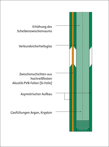 Insulation glass with an asymmetrical structure helps to reduce the influence of resonance frequency. Coincidence dips also occur at various different frequencies, so that clear improvements in soundproofing can be achieved with an asymmetrical structure. - Elements with laminated safety glass and a special acoustic PVB film [SI film]