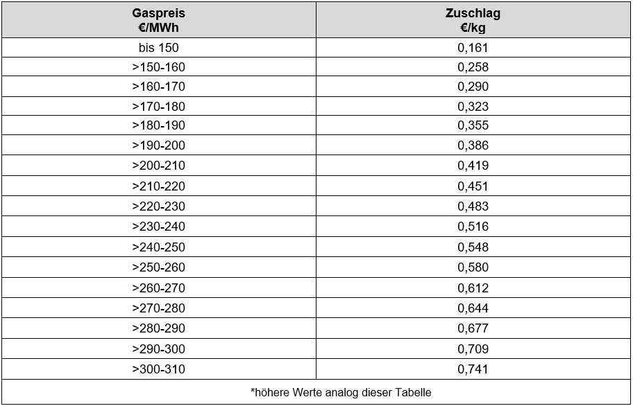 The manufacture of glass is fundamentally subject to a very energy-intensive manufacturing process. The European glass industry therefore introduced a gas price-dependent energy cost surcharge at the beginning of 2022. With our circular at the end of January 2023, we informed you that a new base price of €150/MWh will be set from AE February 1, 2023. If this value is exceeded, the old billing mode takes effect again with a dynamic, monthly adjustment.