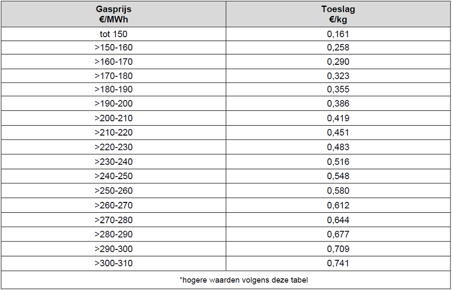 Het bedrag van de toeslag kan soms aanzienlijk variëren en wordt elke maand vastgesteld op de op twee na laatste (3) werkdag van de maand (M) en vervolgens toegepast vanaf de eerste dag van de volgende maand (M+1). Het bedrag is gebaseerd op de gemiddelde maandelijkse aardgasprijs volgens de Duitse grondstoffenbeurs EGIX®-THE. Toegang tot de EGIX®-THE verkrijgt u via de volgende link: www.powernext.com/futures-market-data